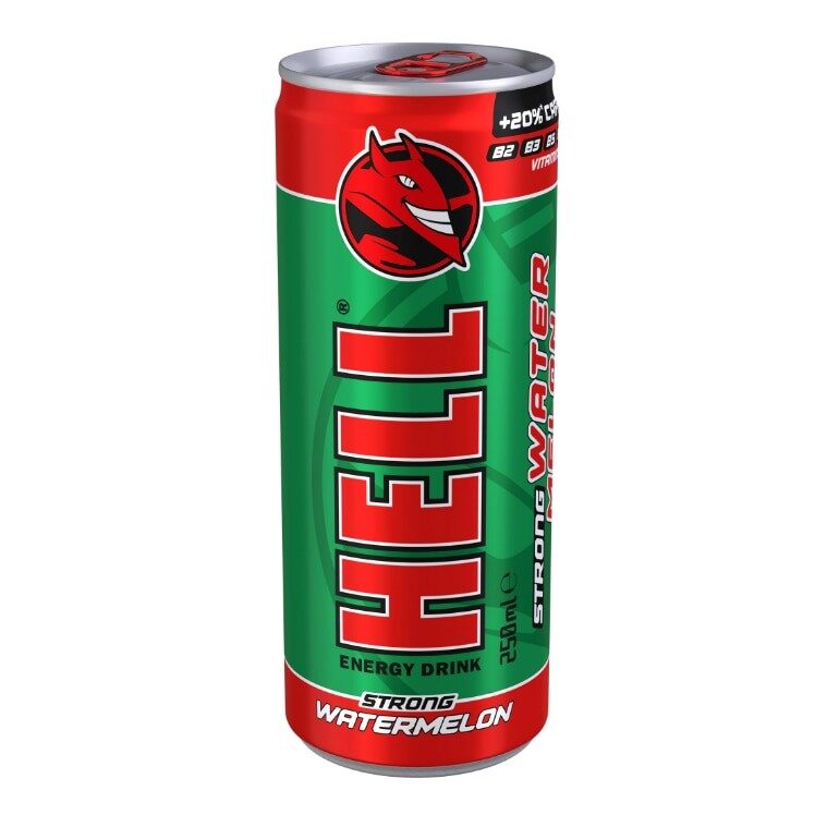 EȘTI ÎNCÂNTAT DE AROMA DE PEPENE? HELL STRONG WATERMELON dorește să fie partenerul tău zilnic, nu doar cu 32mg/ 100ml de cofeină. Conține +20% mai multă cofeină, are cinci Vitamine B diferite și nu conține conservanți. HELL STRONG WATERMELON are, de asemenea, un ambalaj reciclabil.